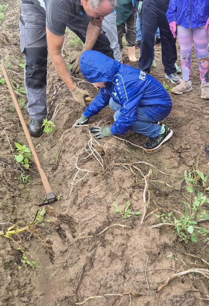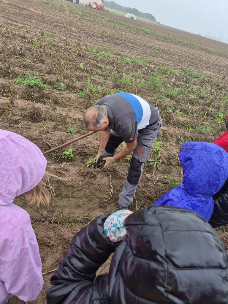 Nach einer herzlichen Begrüßung des Kartoffelbauers führte dieser uns auf seinen Acker. Unter der Erde warteten dort bereits die zahlreichen Kartoffelknollen auf uns. Auf dem Acker durften die Lernenden der Klasse 3 sowie 5/6 mit den Händen oder mit den zuvor erklärten Werkzeugen die Kartoffeln ausgraben. Anschließend zeigte er uns, wie die Kartoffeln mithilfe einer Maschine sortiert und abgewogen werden – auch dabei packten die Lernenden tatkräftig mit an.