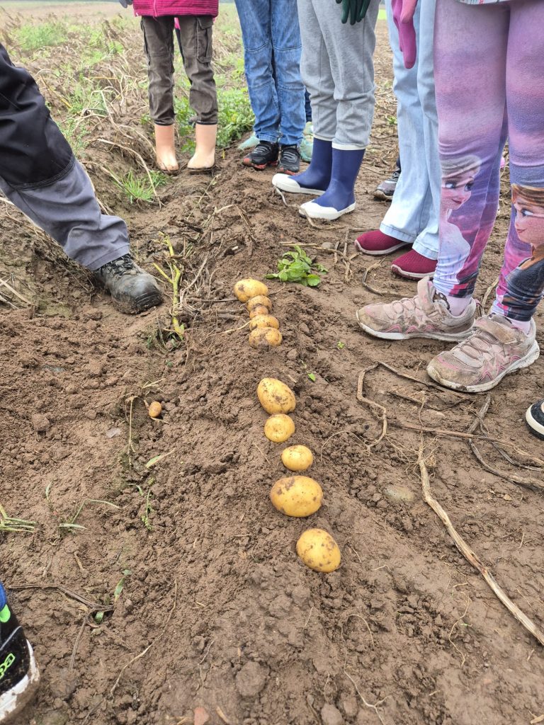Neben vielen interessanten Fakten rund um die Kartoffel sammelten wir gemeinsam einen Sack voll der braunen Knollen, die wir nun in der Schule weiterverarbeiten dürfen.